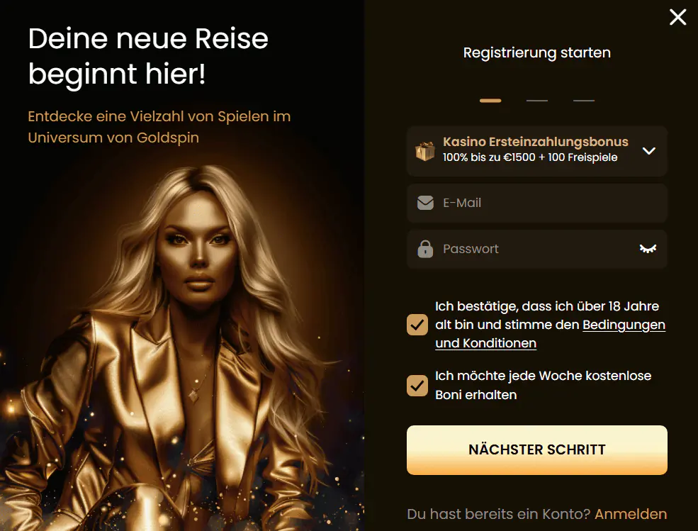 Neue Spieler werden beim Gold Spin Casino mit einem einfachen Anmeldeprozess begrüßt. Direkt auf der Startseite kann man sich mit wenigen Klicks registrieren. Nach der Eingabe der persönlichen Daten, einer kurzen Verifizierung und der Einzahlung steht der Einstieg ins Spielerlebnis offen. Über den Goldspin Casino Login gelangen Sie in Ihren persönlichen Bereich, wo Sie Einzahlungen vornehmen, Boni aktivieren und Spiele starten können. Hier nochmal alles in Einem: