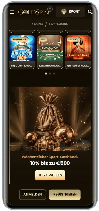 - Registrieren bzw. Anmelden. Erstellen Sie ein Konto, sofern Sie noch keines haben oder melden Sie sich mit Ihren Zugangsdaten auf der Goldspin-Website an.